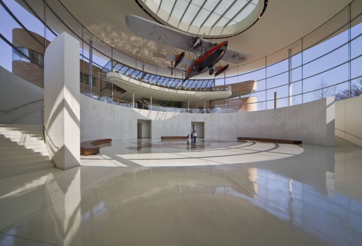 Im Herzen der Fortaleza Hall dient eine geschwungene Betonwand als architektonischer Mittelpunkt. Die Oberfläche zeigt ein Graphic-Concrete-Wandbild, bei dem Fotografien nahtlos in den Beton übertragen wurden.