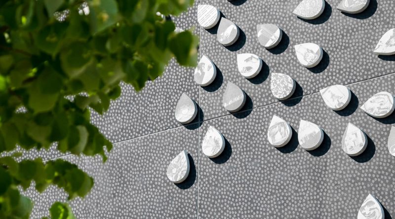 The new theatre building in the centre of Imatra, Finland gave the residences a new landmark: a 17-metre tall precast Graphic Concrete stage tower. Artist Landys Roimola designed the artwork, called The Drop. The theme was a natural choice, with water and the rapids known as the symbols of the town of Imatra. Small water drops make up the background pattern on the beautiful façade. 150 larger concrete drops complete the artwork; each one separately cast and attached. When looking closely, you can see that each drop tells a story related to theatre.