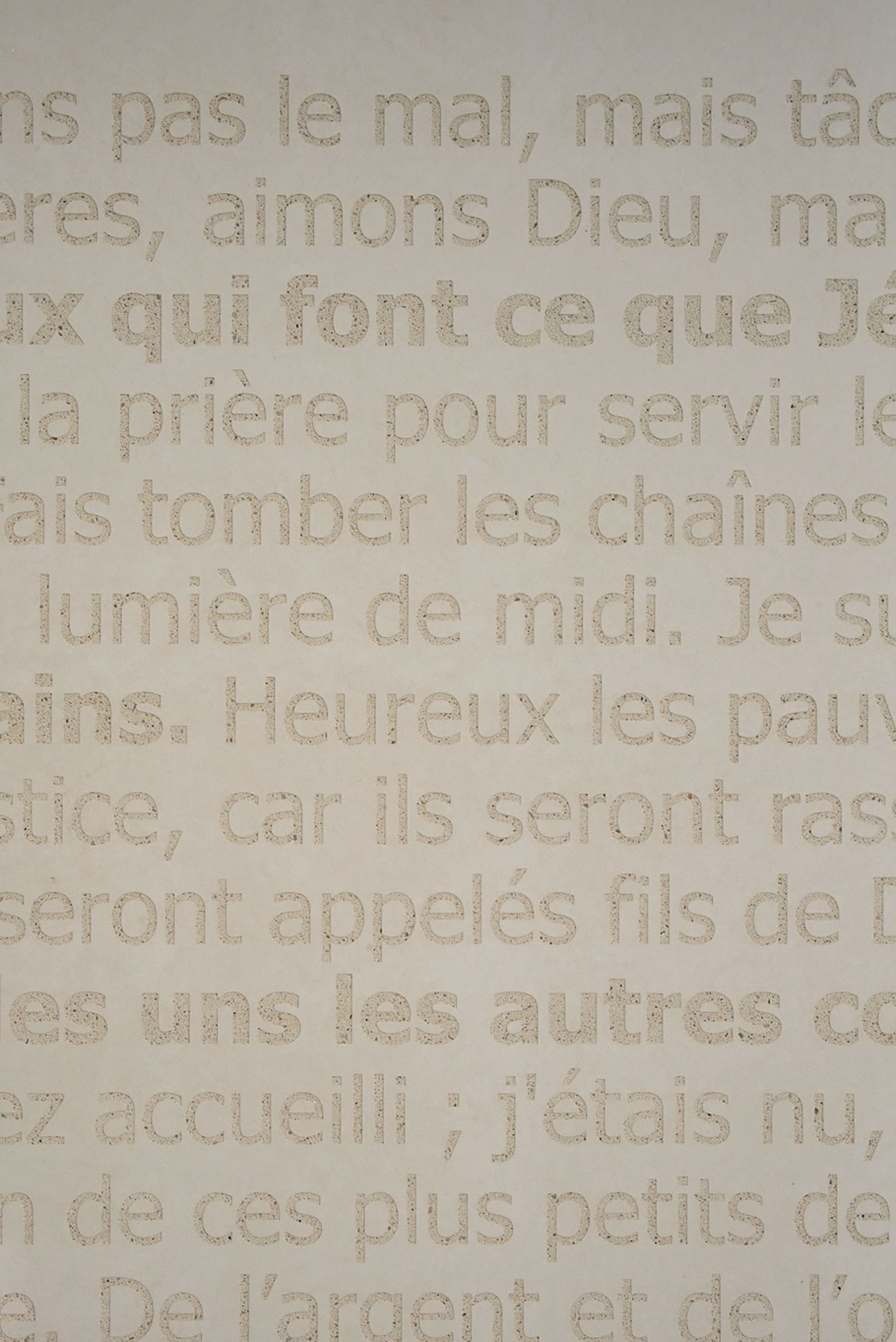Externally the design is dominated by a large wooden cross that metaphorically divides the earthly from the spiritual. The church was designed to be modest and in keeping with its environment. Accordingly, concrete, wood and zinc were chosen for the main building materials. The pale hues of the structures combined with the light reflecting from the upper windows and zinc roof reinforce the nobility of the building. Closer inspection of the concrete façade reveals that the surface is not smooth and that it in fact features quotes from the Bible and texts by Saint Vincent de Paul reproduced in vertical lines.