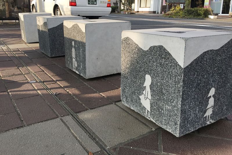 As a promotion for the International Kenpoku Art Festival in 2016, cubic benches with cartoon-like illustrations on each side was designed. The cubes have strong local ties. In addition to the illustrations having a special meaning to the locals, the cubes were produced of local raw materials in collaboration with local designers and local concrete prefabricators.