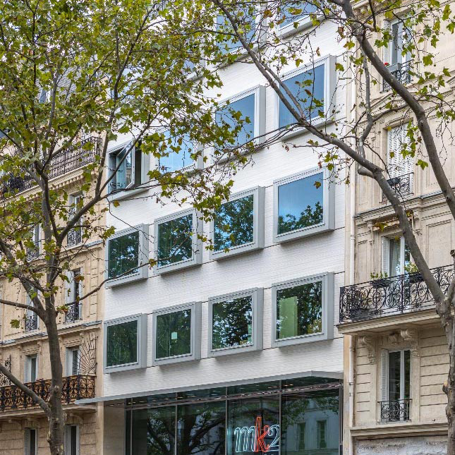 Kaukaa julkisivu näyttäytyy täysin valkoisena, mutta pinta ei ole täysin tasainen. Teksturoitu pinta
