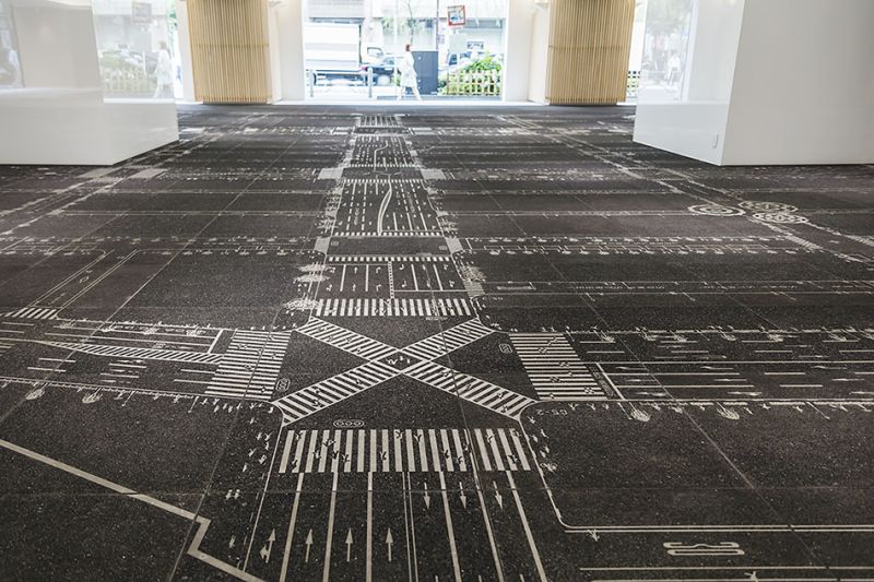 G735 Gallery is a multi-functional exhibition space for cars and artwork located in the heart of Ginza, Tokyo. A total of 1500 pieces of precast Graphic Concrete floor tiles illustrates the streets of the Ginza area. The black exposed aggregate -surface and the surface of the smooth white lines gives a maximum contrast, showing the map very precisely.
