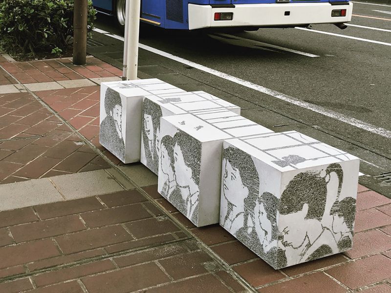 As a promotion for the International Kenpoku Art Festival in 2016, cubic benches with cartoon-like illustrations on each side was designed. The cubes have strong local ties. In addition to the illustrations having a special meaning to the locals, the cubes were produced of local raw materials in collaboration with local designers and local concrete prefabricators.