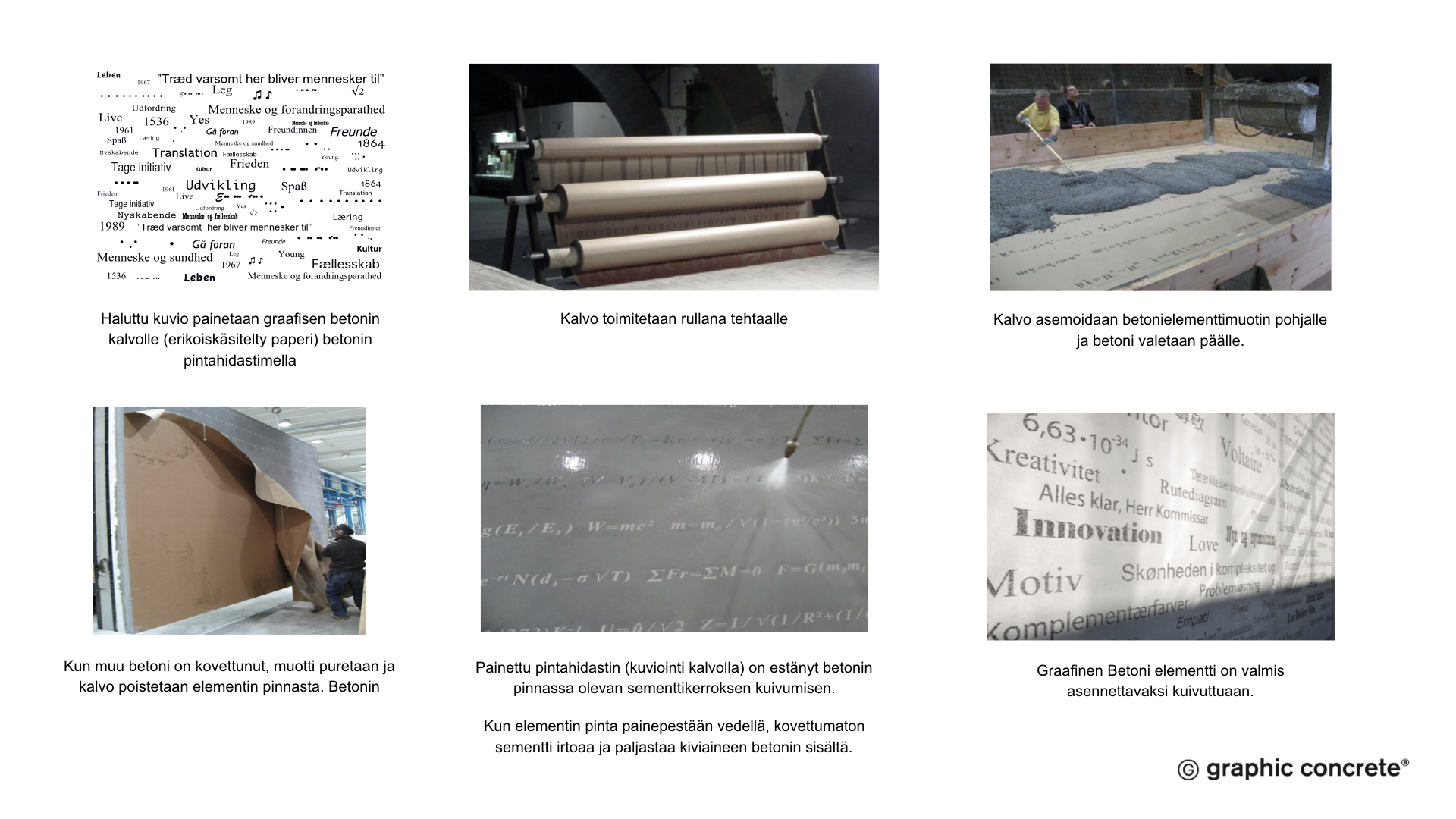 Graafinen Betoni mahdollistaa lähes minkä tahansa kuvion tai kuvan betonielementtipinnalla. Se avaa rajattoman valikoiman suunnittelumahdollisuuksia. Lopputulos on 100% betonia, ja näin yhtä kestävää kuin mikä tahansa betonipinta.